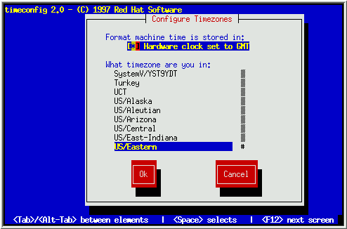 Next, the installation program presents a dialog to help you configure your Red Hat Linux system's timezone (see Figure 33).