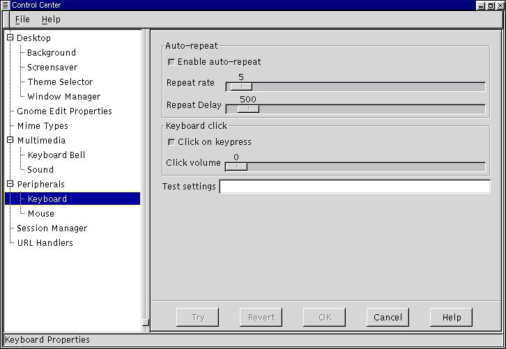There are currently two settings for the keyboard in this capplet. You may change the properties of Auto-repeat and the Keyboard Click.