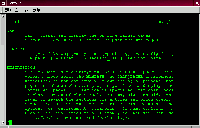 Of course, like any good help system, the man command has its own man page. At the prompt, type