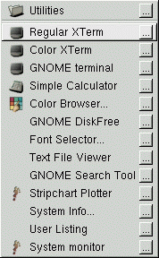 Here, in the first entries of this new submenu, there is a choice of terminal windows: Regular Xterm, Color Xterm and GNOME terminal (as shown in Figure 2-2). To get a shell prompt, position the cursor over the terminal window of your choice, and release the mouse button.